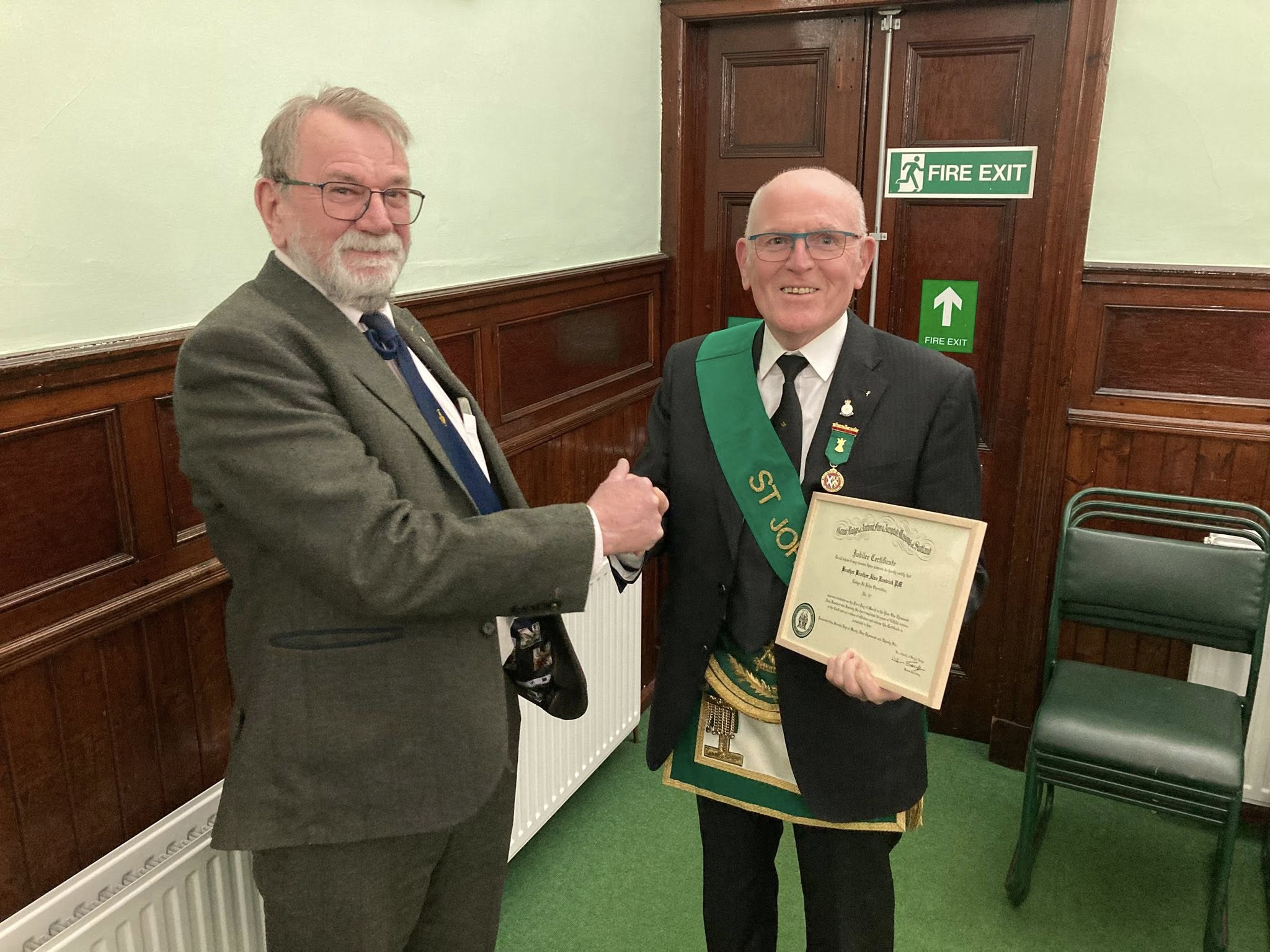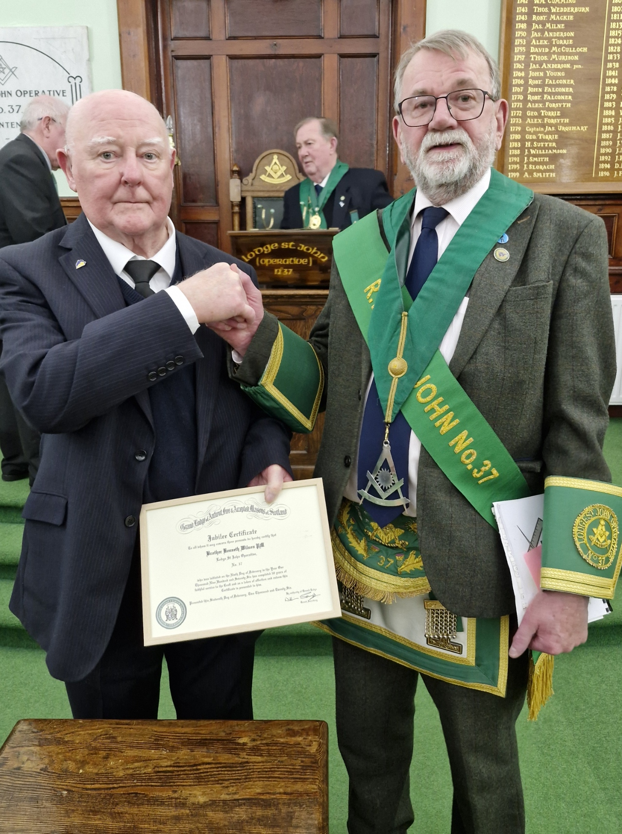 It has been my pleasure, since my return to regular attendance, to be witness to a number of milestones in our Lodge, with Past Master Mark Bruce being confirmed as Provincial Grand Master of the Province of Moray and Nairn, Past Master Brother Des Masson being awarded Honorary Grand Rank, and Past Masters Kenny Wilson and Alan Renwick celebrating their Golden anniversaries, having both been Freemasons for 50 years.